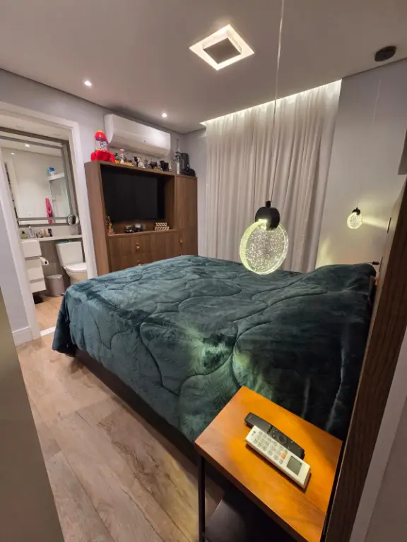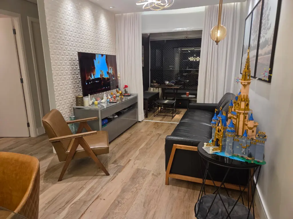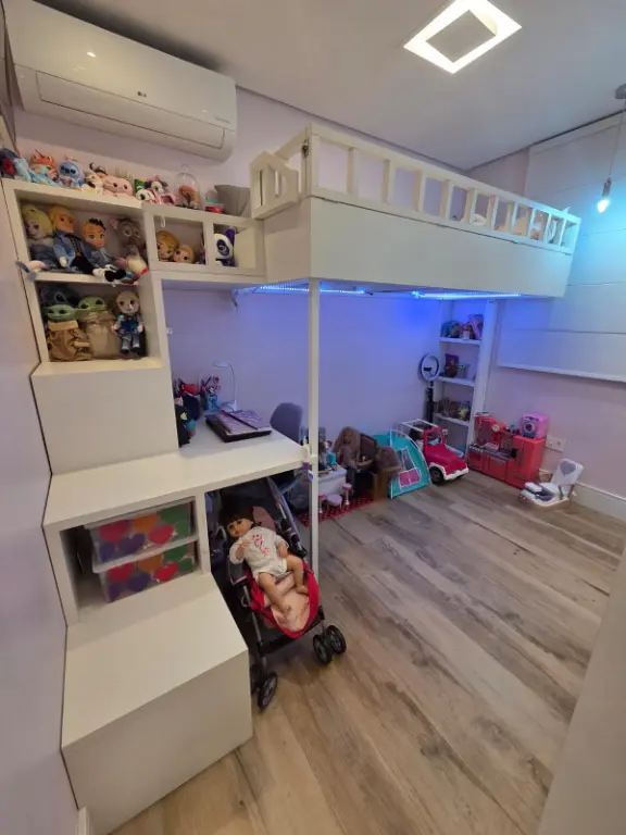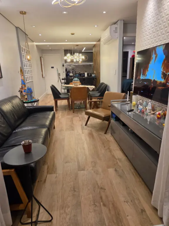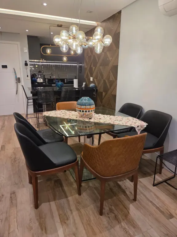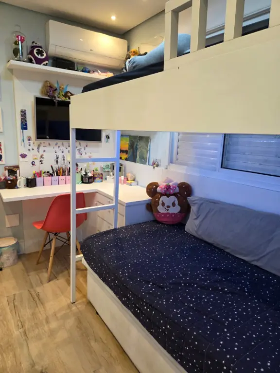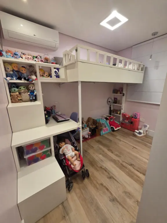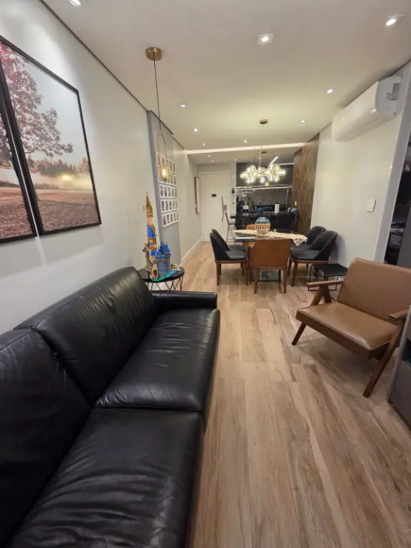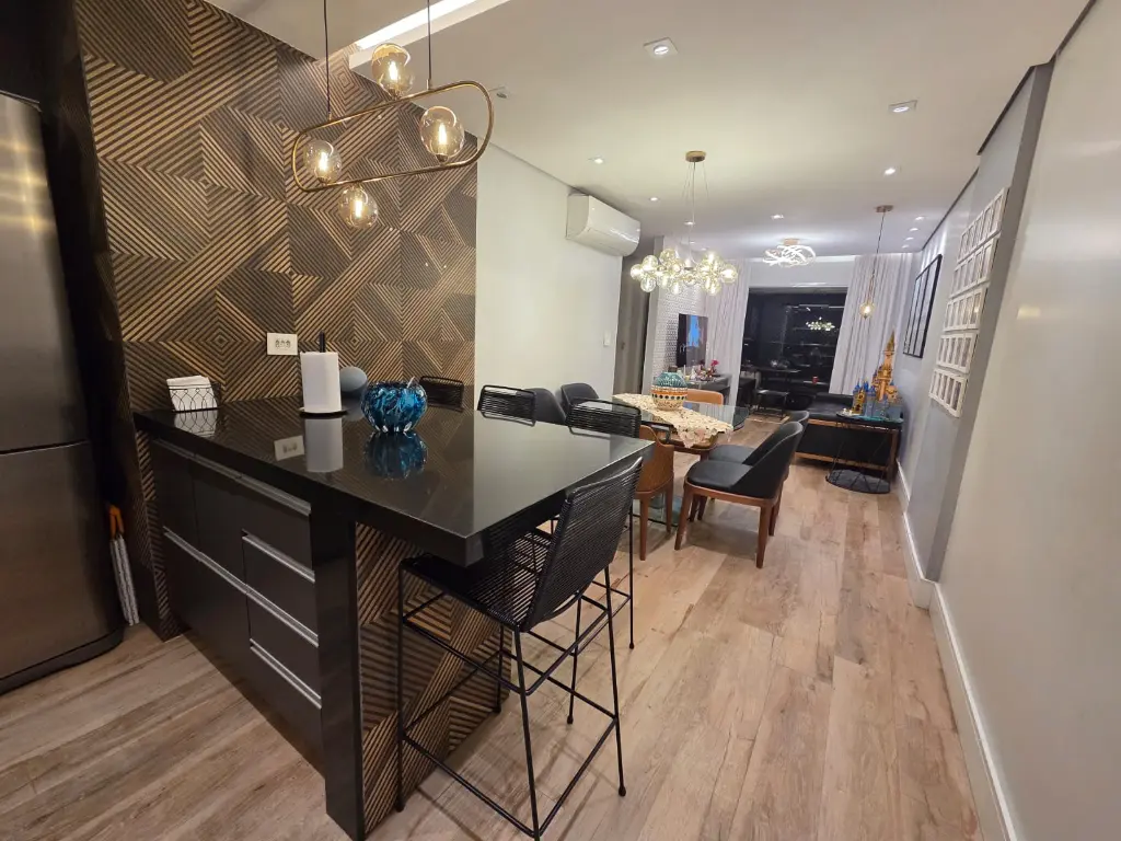 Apartamento com 82 m², equipado com ar-condicionado na sala, na sacada e nos três quartos. Possui 1 suíte, varanda com churrasqueira elétrica e pia, além de 2 vagas de garagem fixas e não travadas.