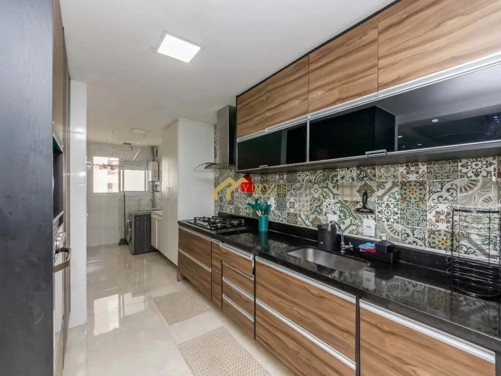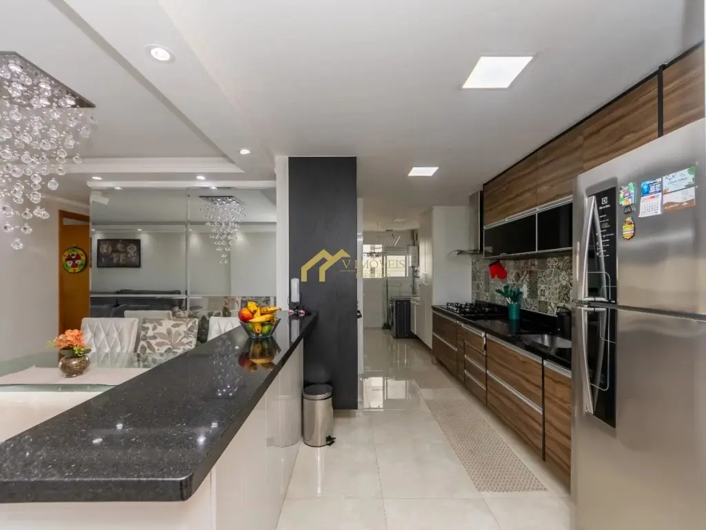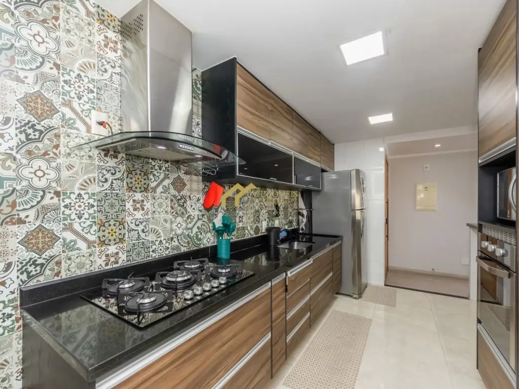 - Cozinha com armários planejados, cooktop, coifa, forno, micro-ondas, filtro de água e geladeira;