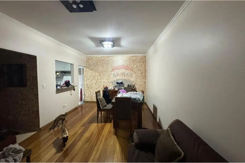 No térreo, ampla sala para 02 ambientes com piso de madeira, integrando-se a cozinha americana com móveis planejados.