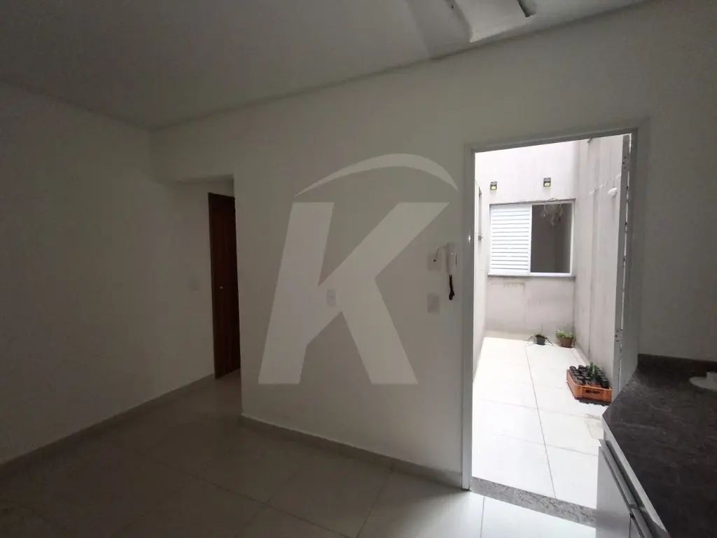 Apartamento medindo 28 m² com 1 dormitório, sala, cozinha americana, banheiro com box e pequeno quintal.