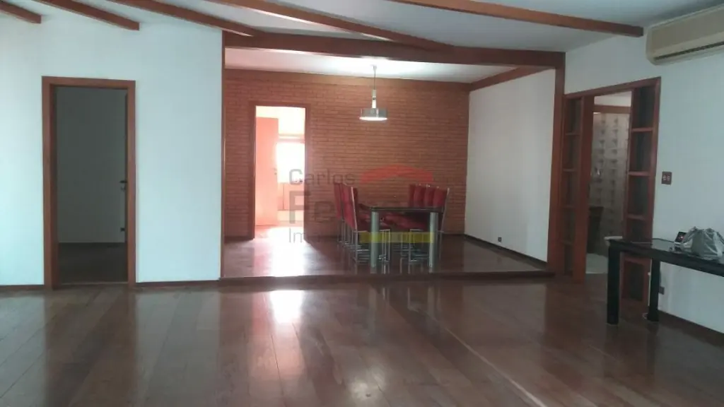Com quatro suítes sendo a máster com closet, todas com armários embutidos, e piso laminado de madeira, Sala para 3 ambientes: de estar com lareira, de TV com bar e de jantar, piso revestido com tábuas de madeira maciça Ipê, Cozinha com armários planejados, Área de serviços. Living para escritório, sala de almoço e sala íntima. Área gourmet com churrasqueira, Espaço para piscina, jardim, dependência de empregados, despensa e 7 vagas de garagem, 4 cobertas e 3 descobertas, entrada lateral de serviços, entrada lateral para área social.