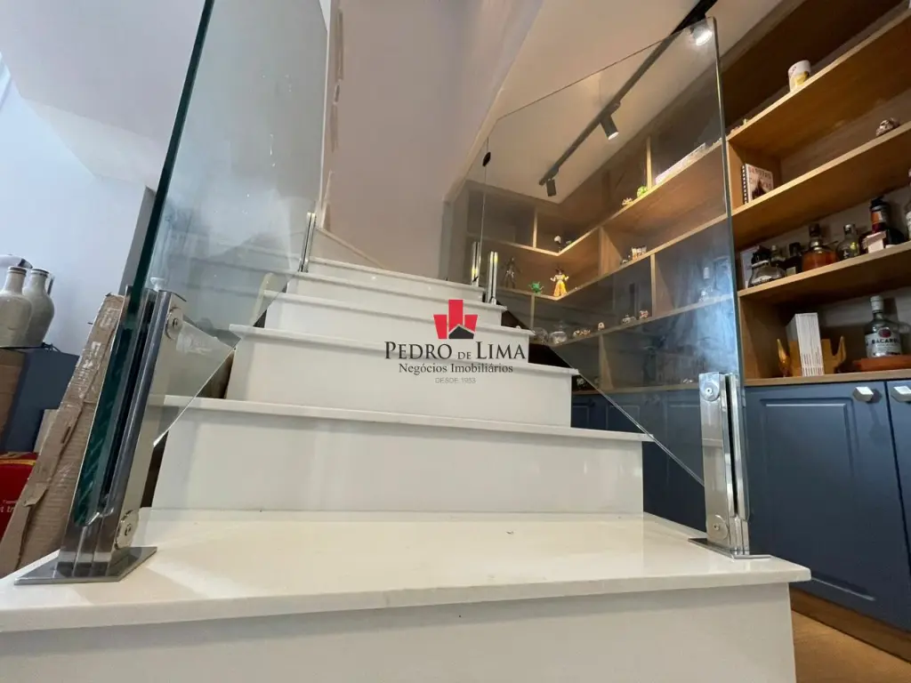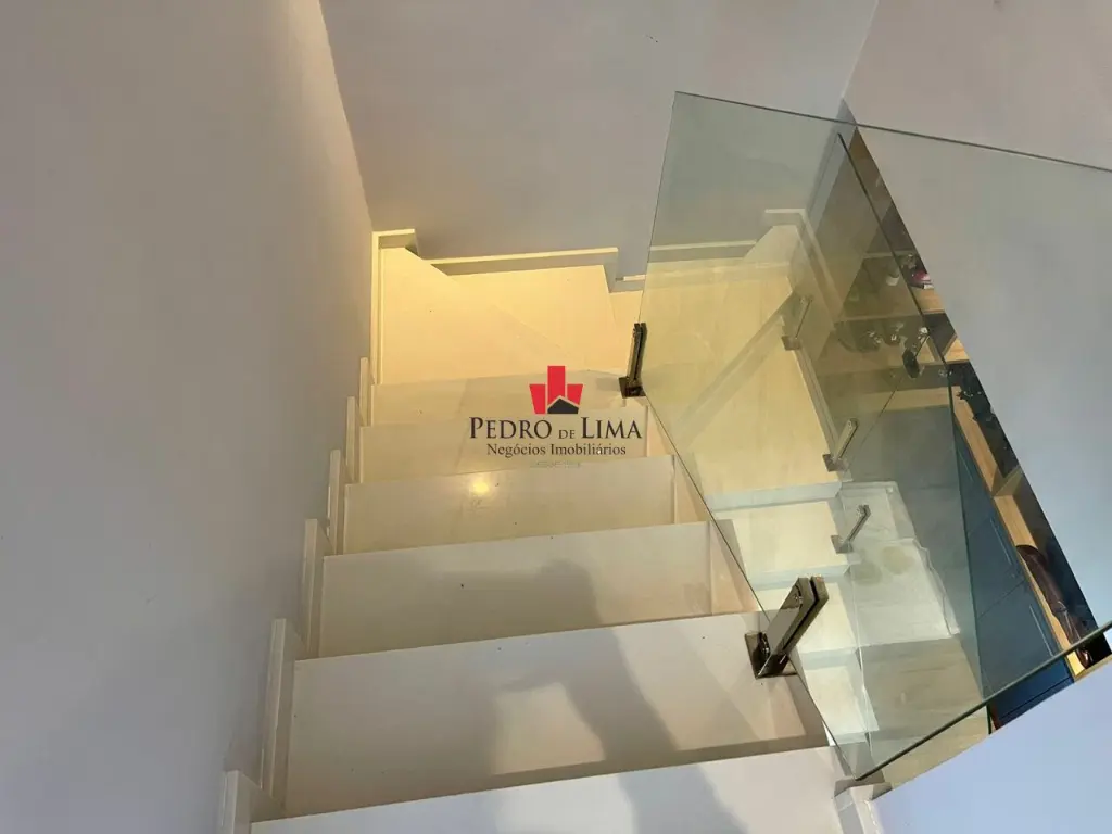 Escada de quartzo branco laterais em vidro temperado, cozinha com pia em quartzo, com cooktop, forno e coifa incluso.