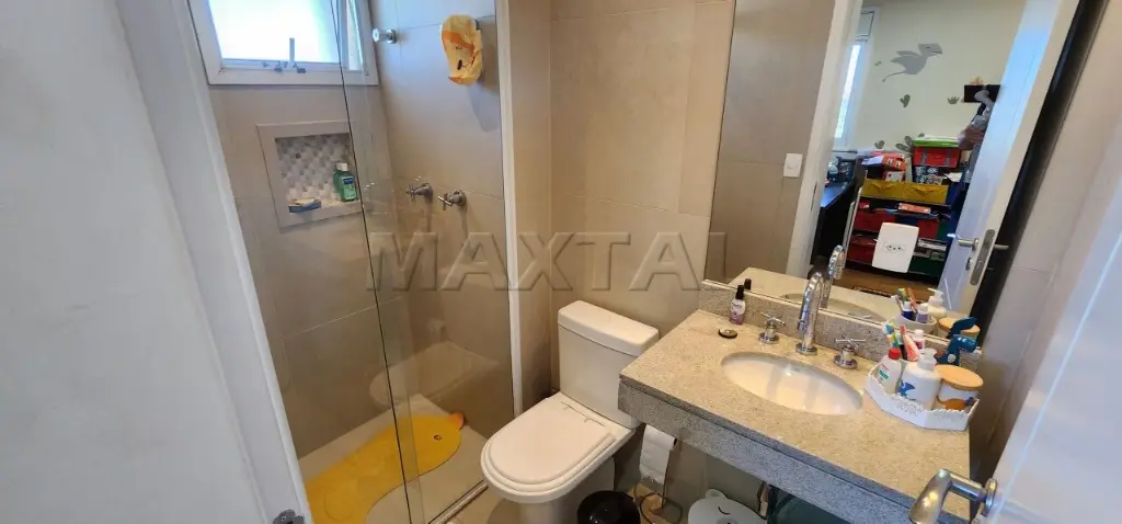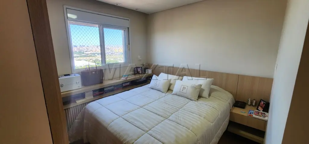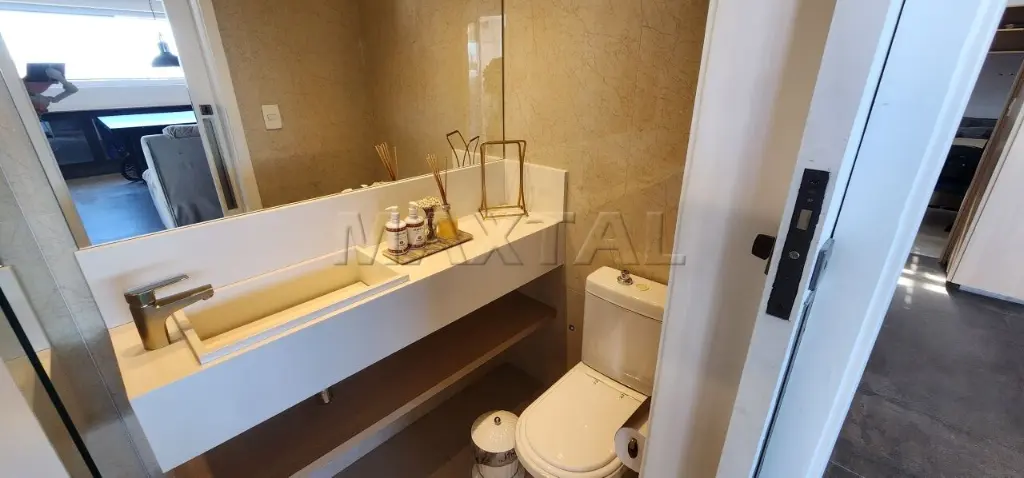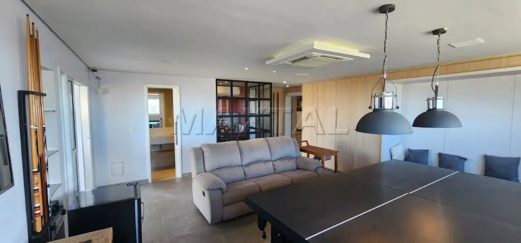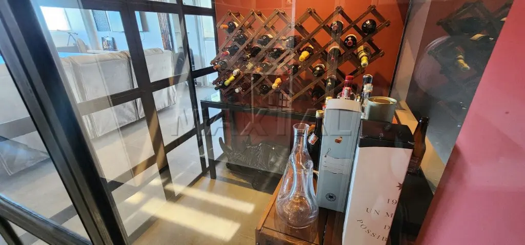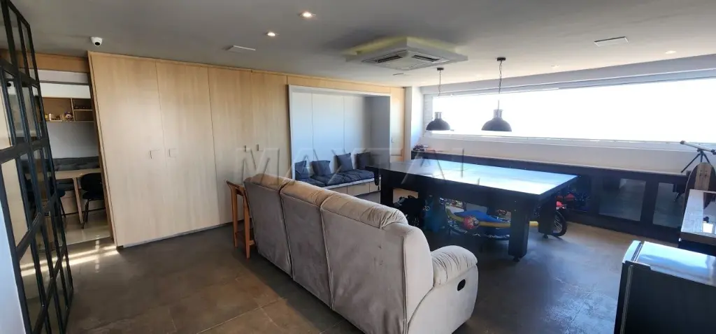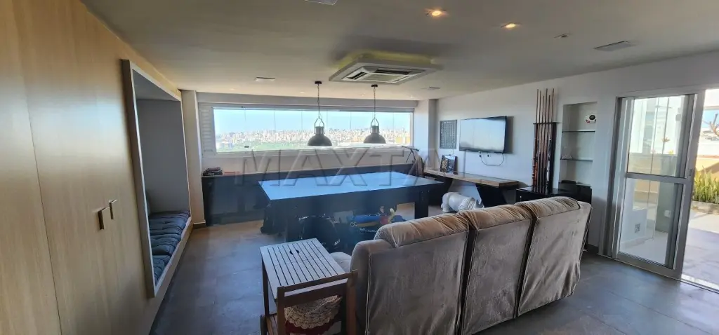 A sala de estar é integrada a um amplo terraço com churrasqueira e balcão de preparo, proporcionando uma vista privilegiada de 180 graus do Campo de Marte e panorâmica da cidade.