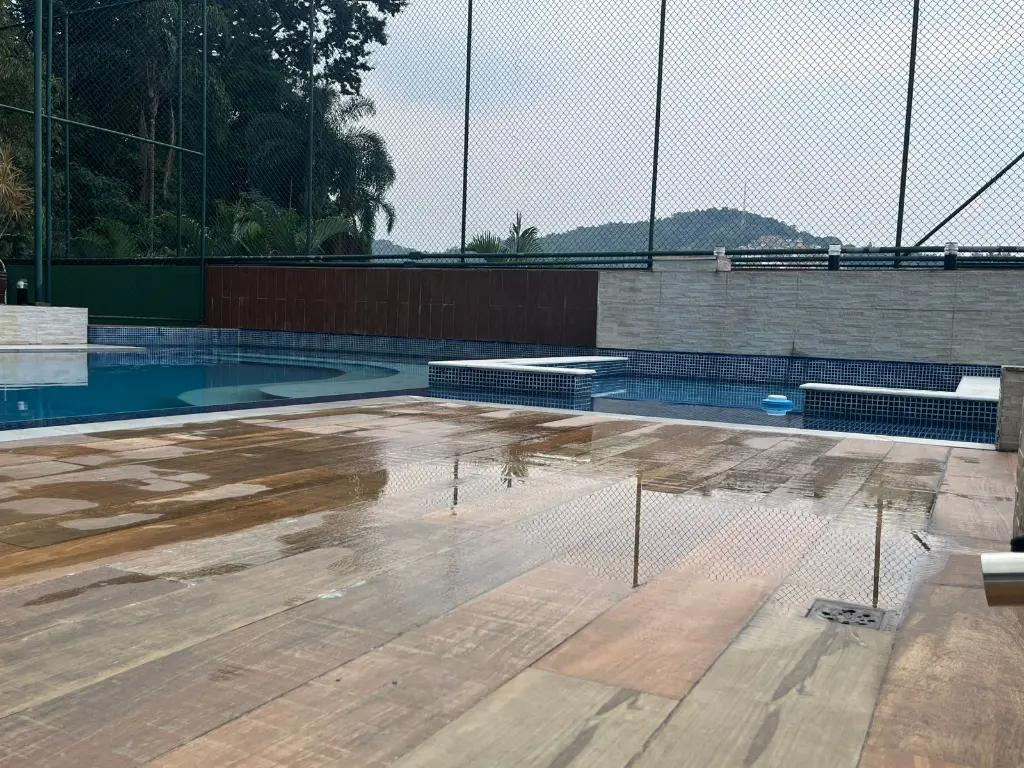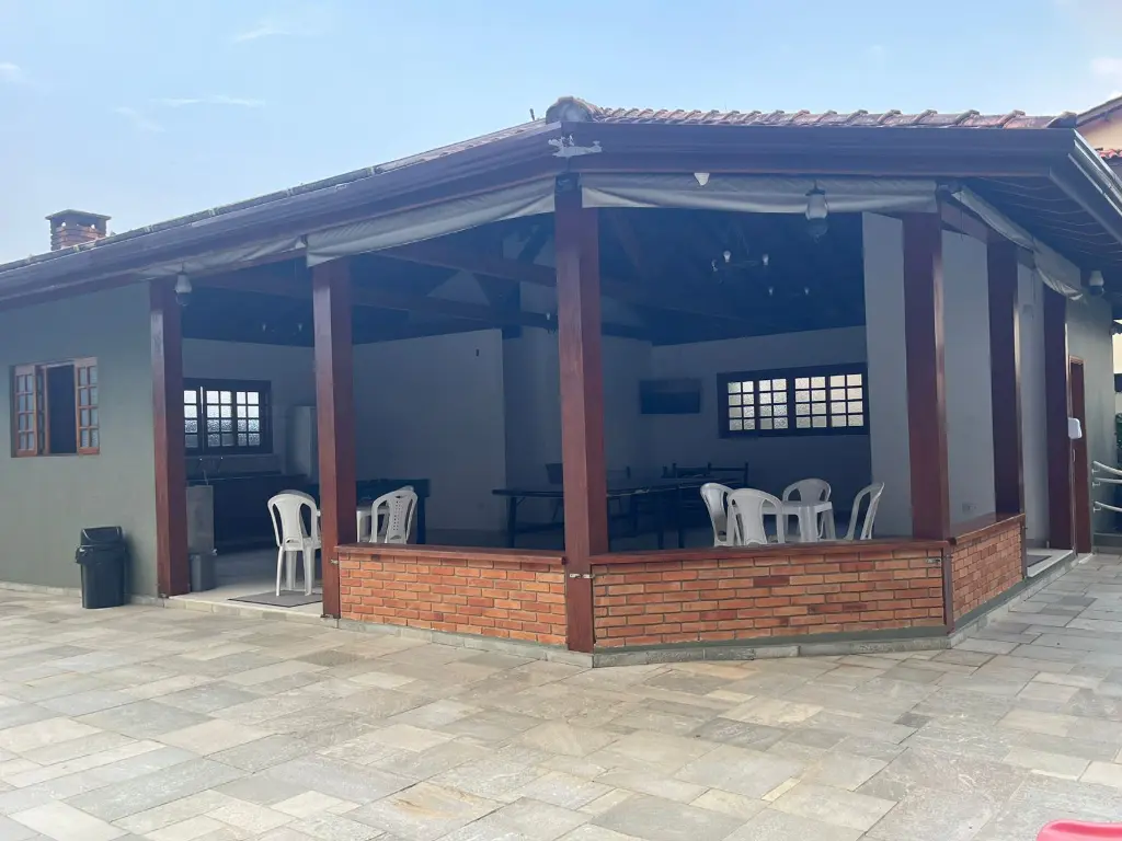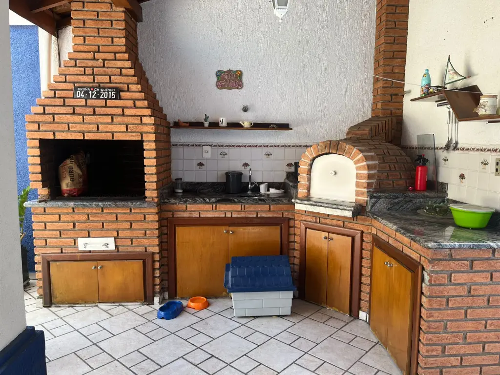 A área gourmet com churrasqueira e forno a lenha é o cenário ideal para confraternizações memoráveis com amigos e familiares, integrando o espaço interno e externo.