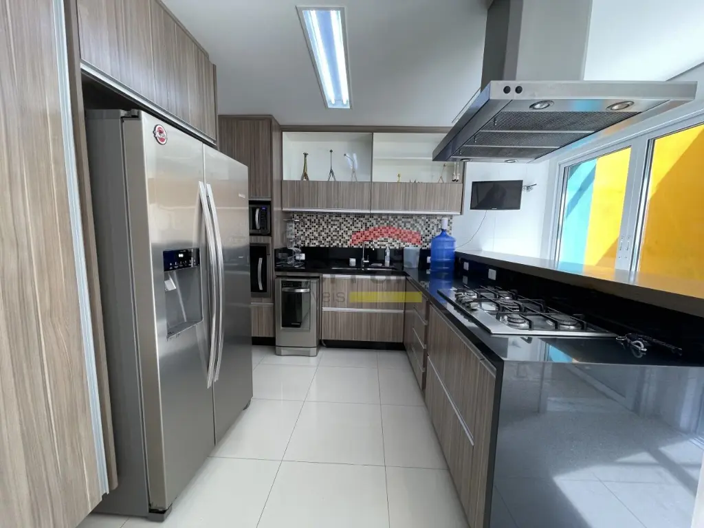 Possui garagem para 5 carros, depósito, escritório, lavabo, sala de estar e jantar integradas, cozinha planejada com eletrodomésticos modernos, área gourmet completa (churrasqueira, forno de pizza e bancada), além de paisagismo e iluminação especial.