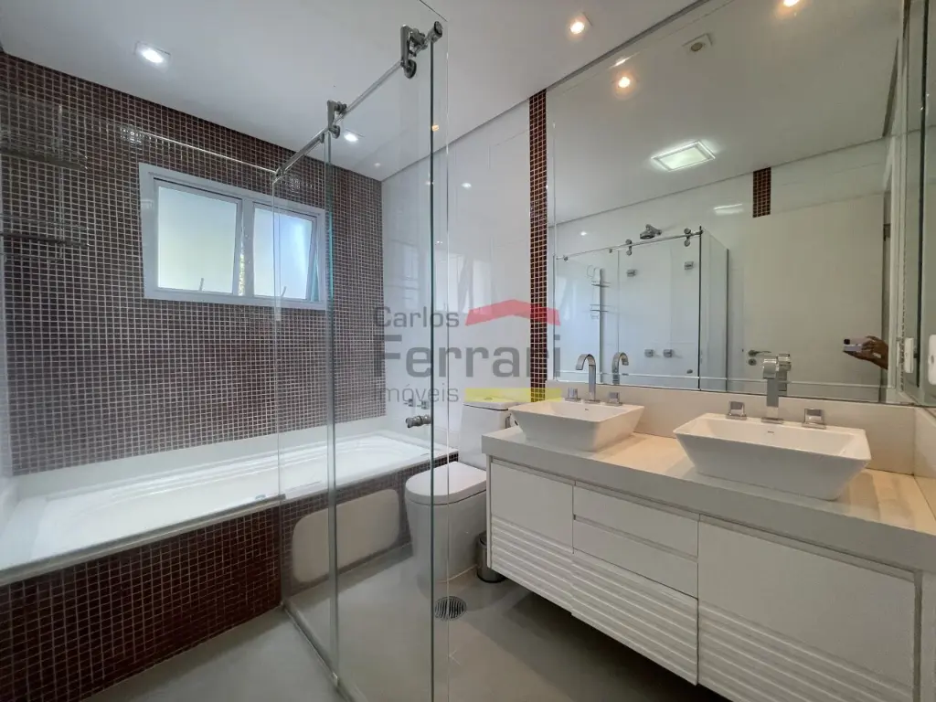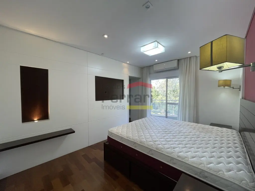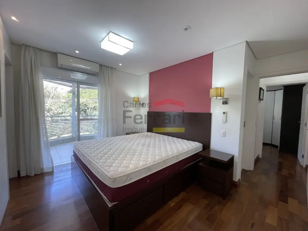 No piso superior, suítes amplas com armários, ar-condicionado e banheiros de alto padrão. Suíte master com varanda, banheira e duas pias. Sala íntima com lareira.