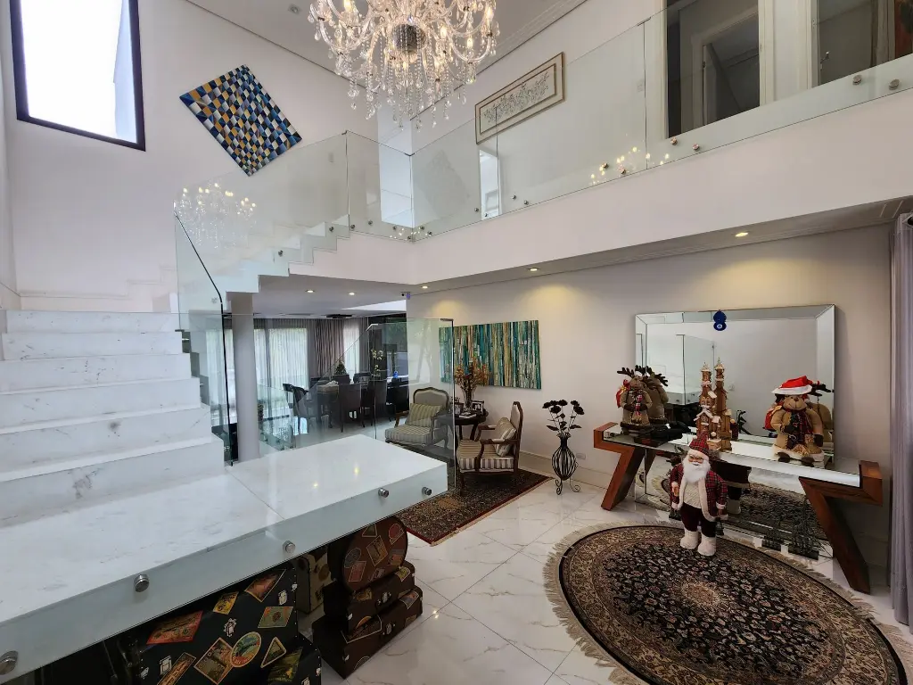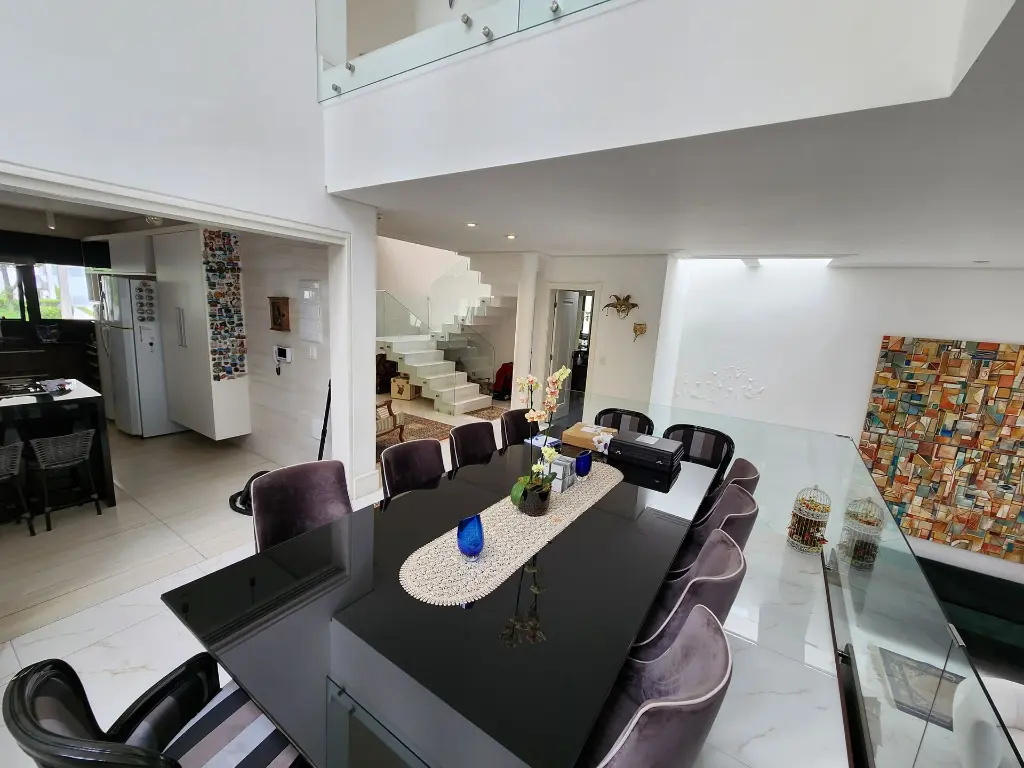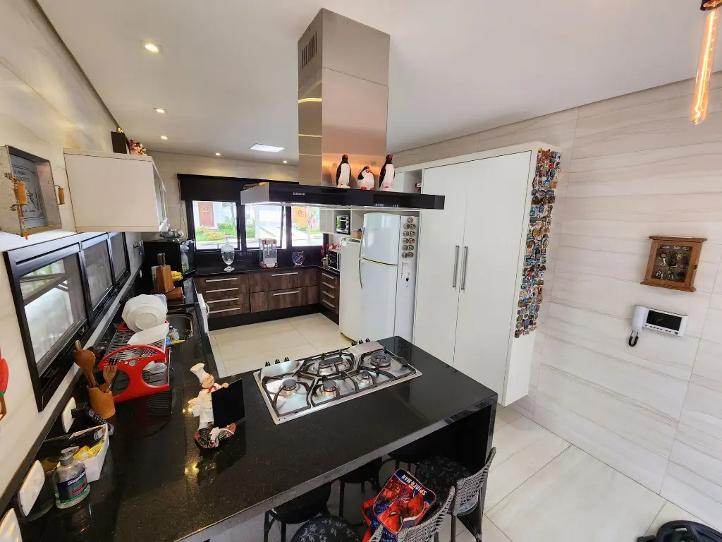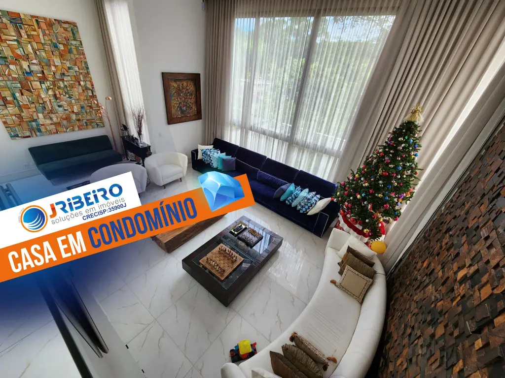 Casa em condomínio de alto padrão com 4 suítes sendo a máster com closet e hidromassagem, 6 vagas de garagem, espaço gourmet completo com churrasqueira e forno de pizza, living com pé-direito duplo para ambientes integrados como sala de estar, sala de jantar, sala de TV, escritório, moderna cozinha com armários planejados, lavabo, quintal com espaço para piscina, corredor lateral, lavanderia, dependência de empregada e depósito.