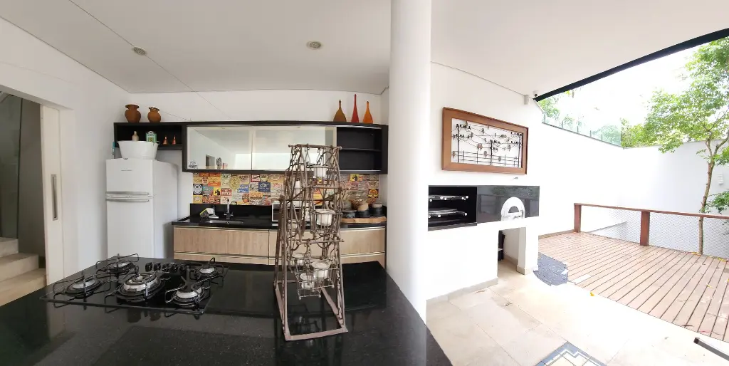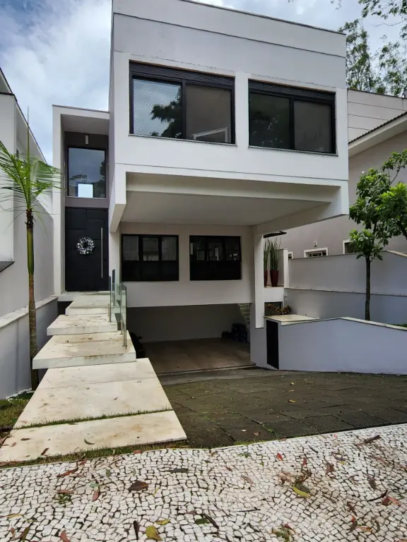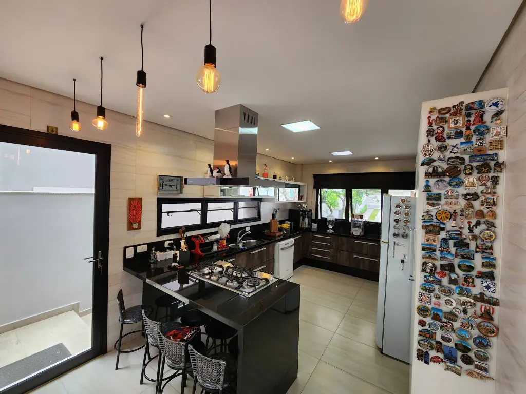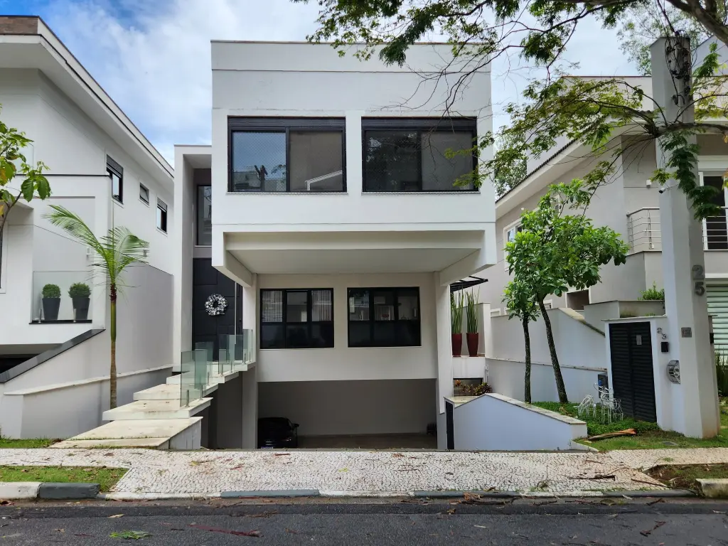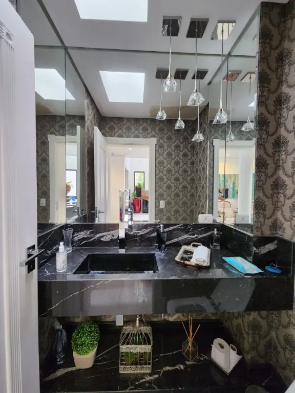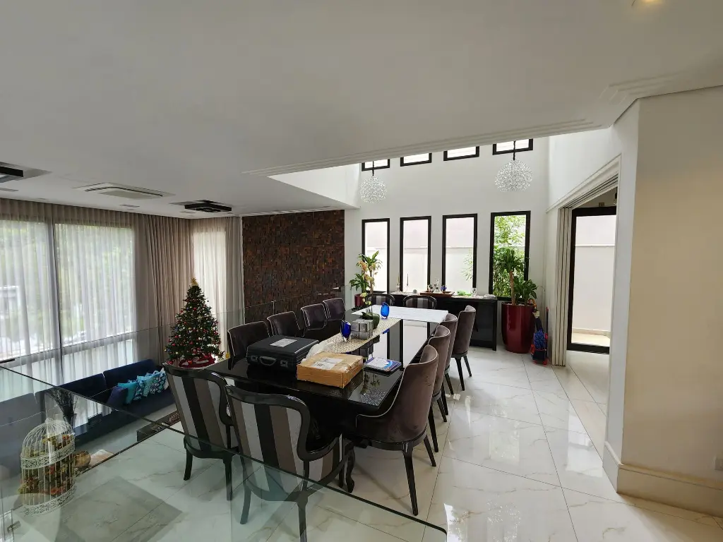 Casa em condomínio de alto padrão com 4 suítes sendo a máster com closet e hidromassagem, 6 vagas de garagem, espaço gourmet completo com churrasqueira e forno de pizza, living com pé-direito duplo para ambientes integrados como sala de estar, sala de jantar, sala de TV, escritório, moderna cozinha com armários planejados, lavabo, quintal com espaço para piscina, corredor lateral, lavanderia, dependência de empregada e depósito.