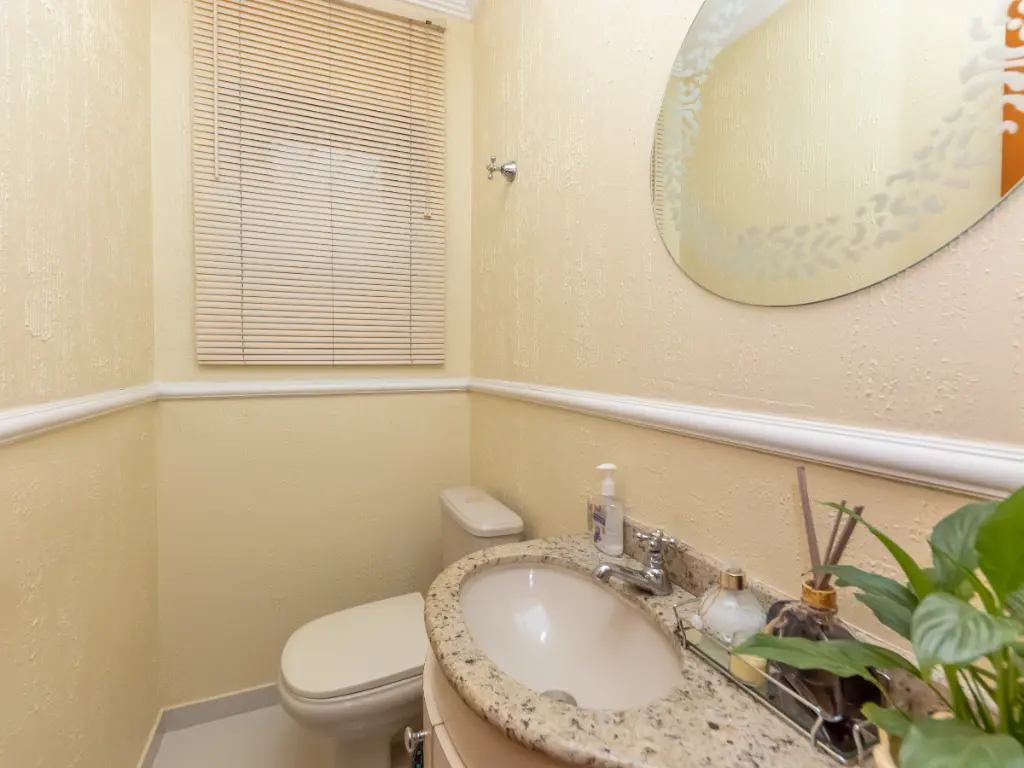 A cozinha com armários planejados oferece funcionalidade e organização. O lavabo atende perfeitamente às visitas, trazendo praticidade à área social.
