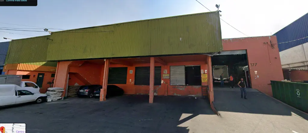 Galpão com ampla área de armazenagem, escritórios e banheiros no mezanino superior, banheiros e vestiário no térreo, docas na fachada.