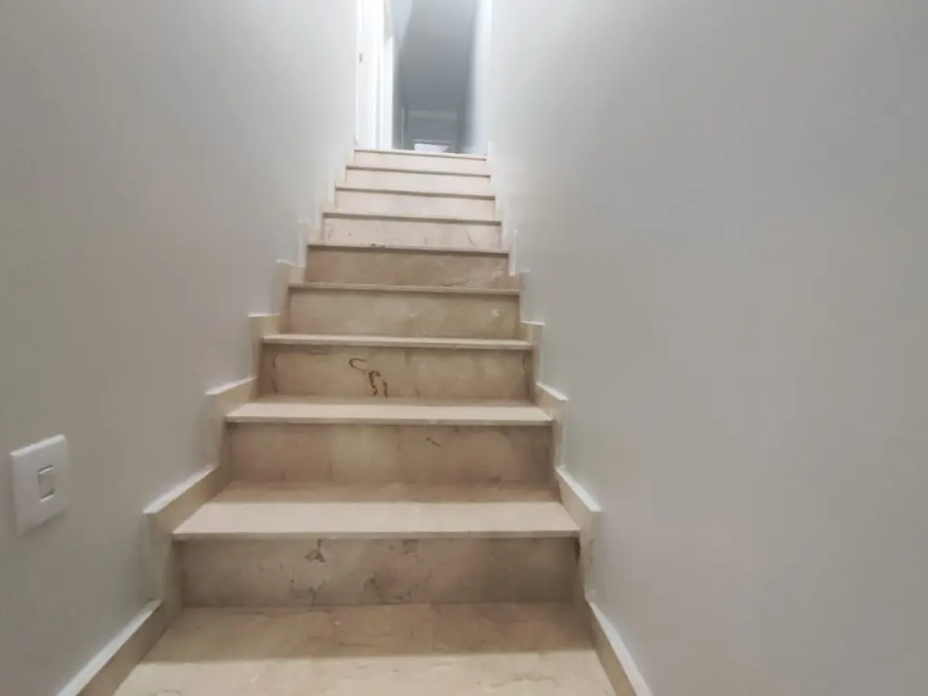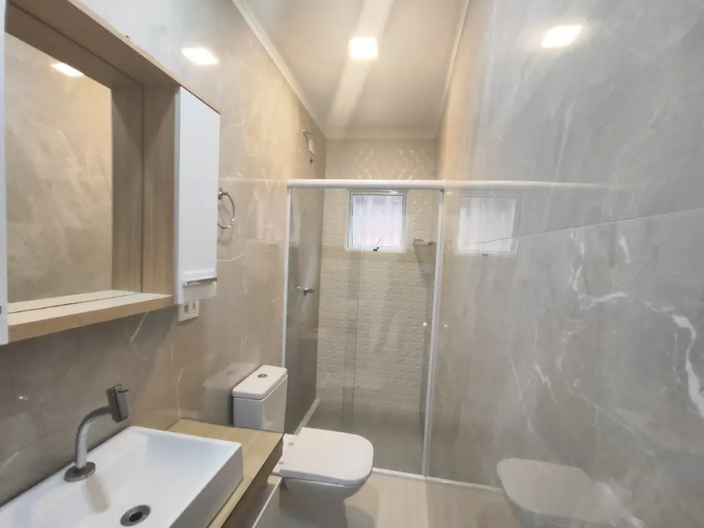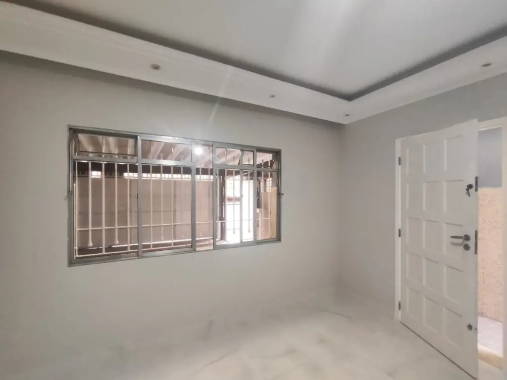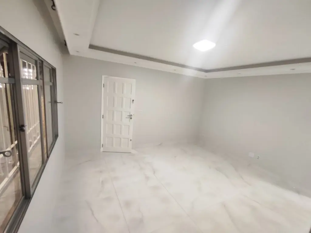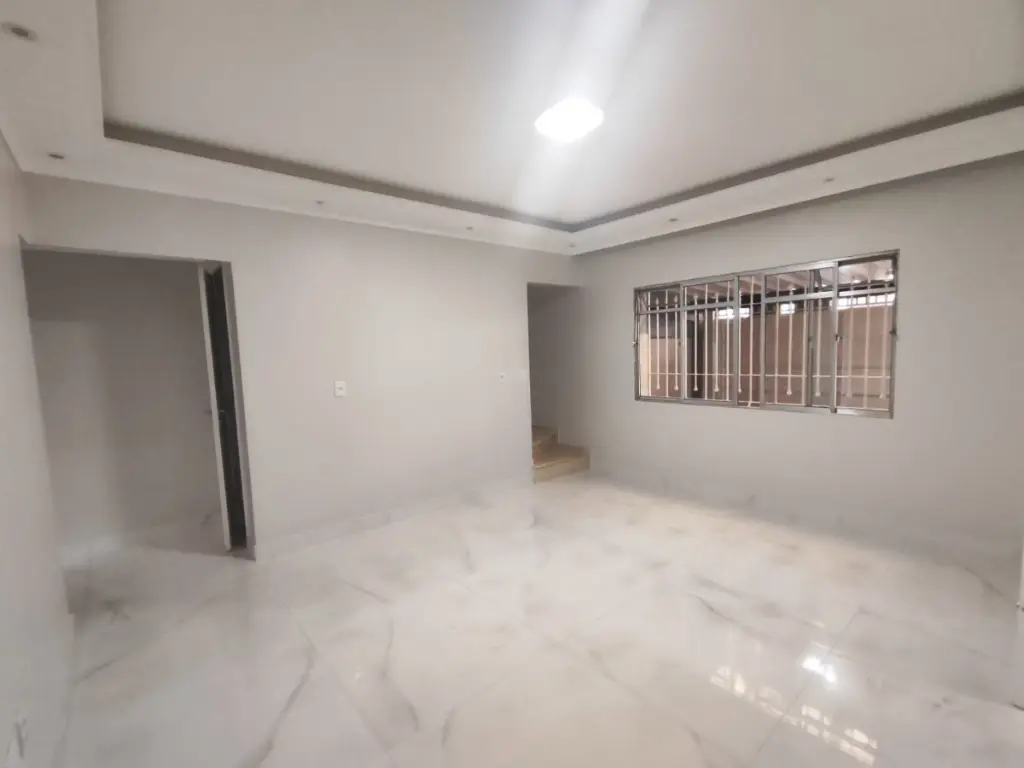 O piso térreo conta com uma sala espaçosa, bem iluminada e ventilada, com piso nobre, sanca com iluminação embutida e uma janela ampla, proporcionando um ambiente moderno e aconchegante. Ainda neste pavimento, há um banheiro social e um pequeno espaço para armazenamento, ideal para organização.