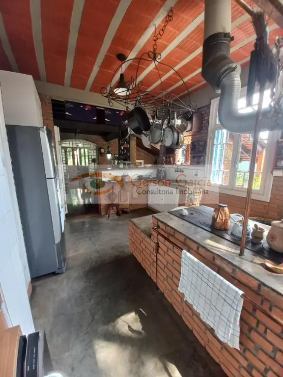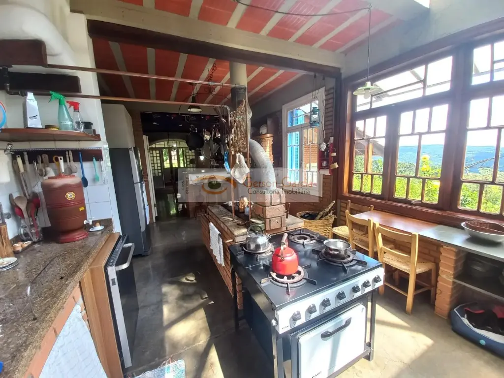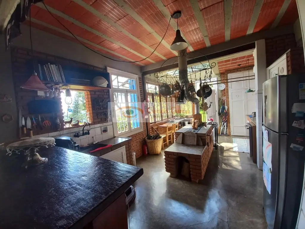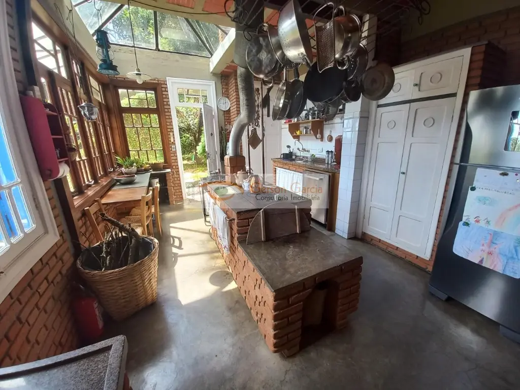 Nível principal ( social ) conta com cozinha charmosíssima, completa, com fogão à lenha no centro, pia, muitas janelas em Pinho de Riga, todas obtidas de antigas demolições do Estado de SP; sistema de aquecimento de água pelo fogão à lenha, com armazenamento e aproveitamento para a própria cozinha; Parte do teto conta com linda cúpula em vidro, proporcionando ainda mais charme e claridade.