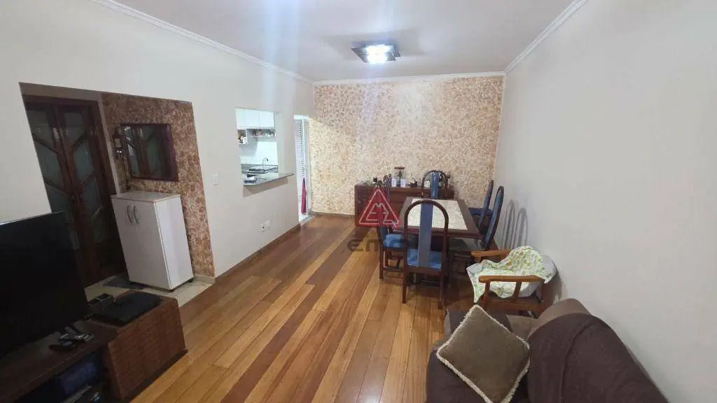 Sala ampla com piso de madeira integrada à cozinha