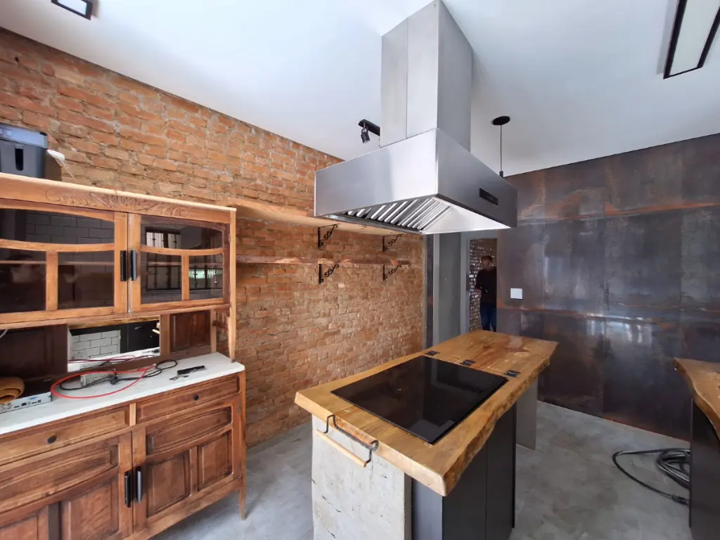 -Cozinha incrível, totalmente planejada, com bancada em madeira de demolição, armários sob medida e cooktop.