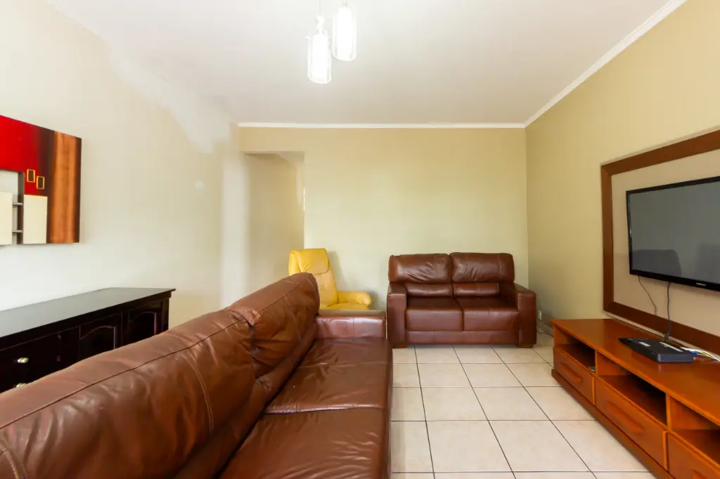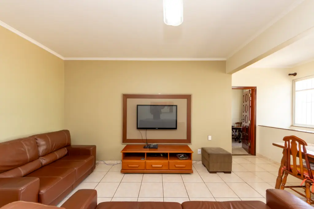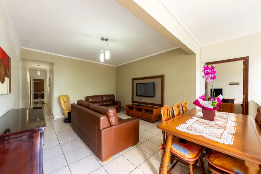 No pavimento principal, o imóvel oferece dois dormitórios, sendo uma suíte, sala espaçosa para dois ambientes, cozinha ampla e independente com espaço para mesa de refeições, dois banheiros completos, lavanderia e área de serviço bem distribuídas, além de depósito e duas vagas de garagem.