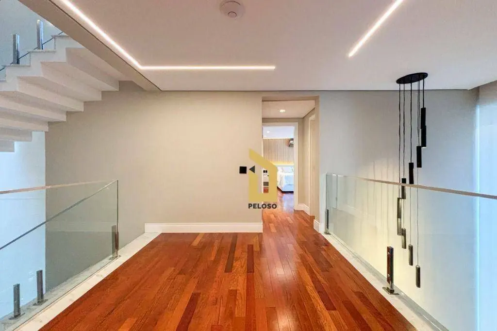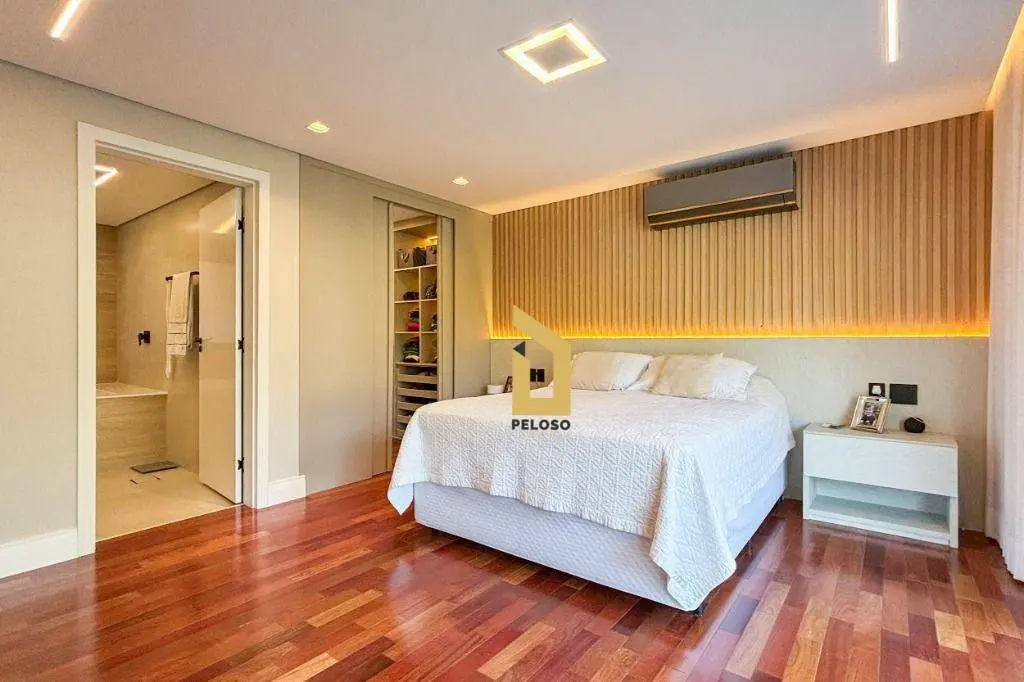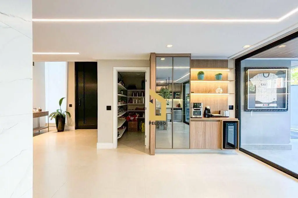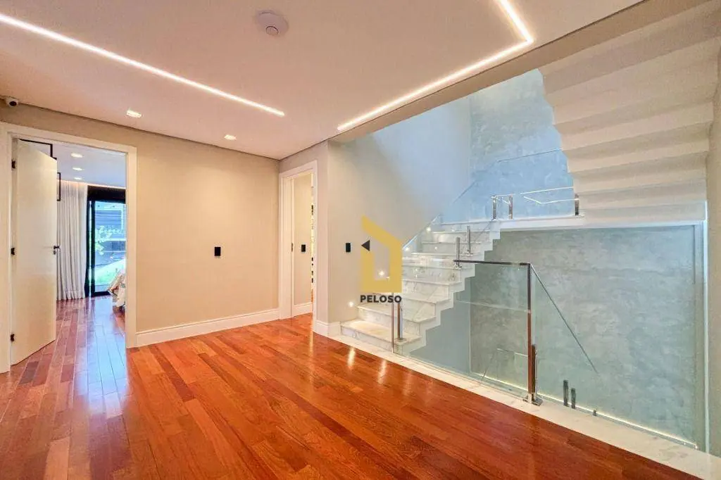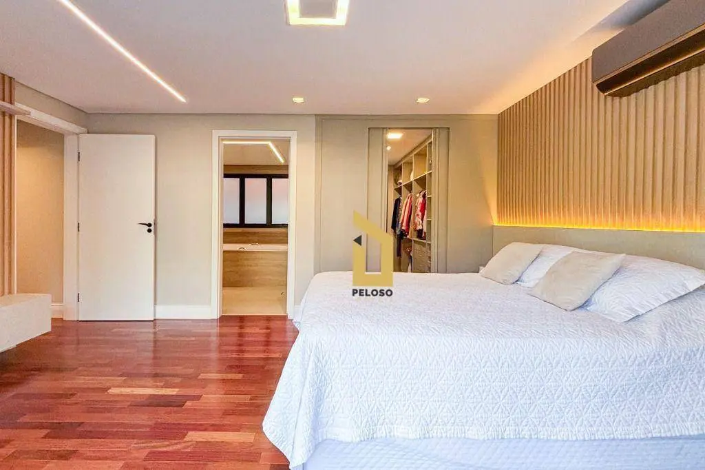 São 5 suites todas com closet, ampla sala de jantar, sala de TV, sacada, cozinha integrada ao espaço gourmet, suite de empregada, direito duplo, espaços confortáveis e arejados, iluminação natural, persianas black out, ar condicionado, todos os ambientes com armários embutido de qualidade e sofisticação, piso porcelanato e madeira maciça, porta principal de 5,20m, fechadura digital e muita elegância.