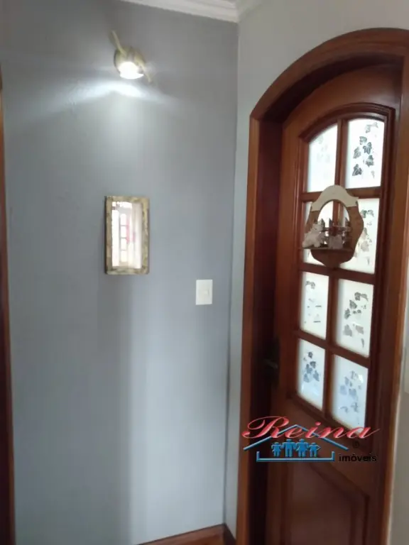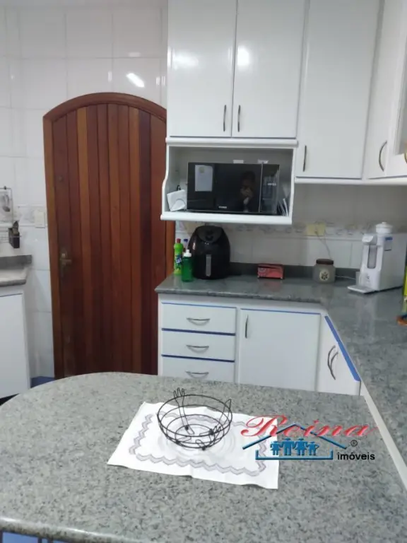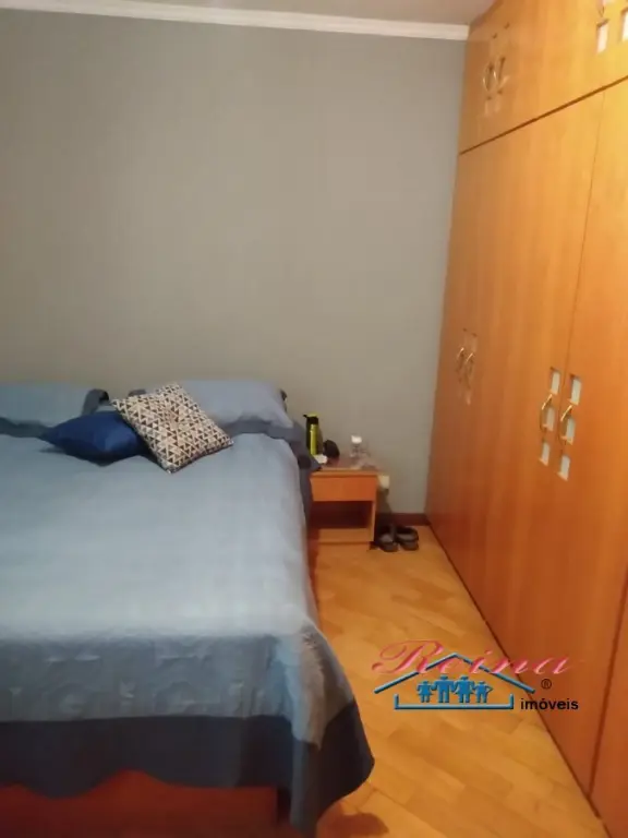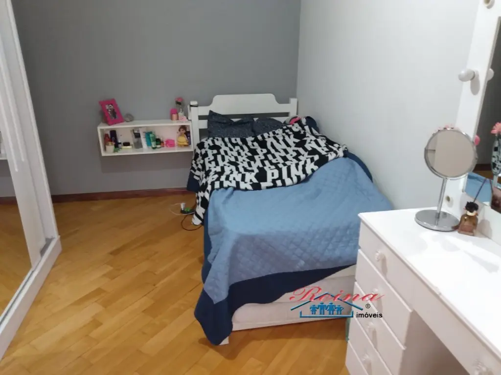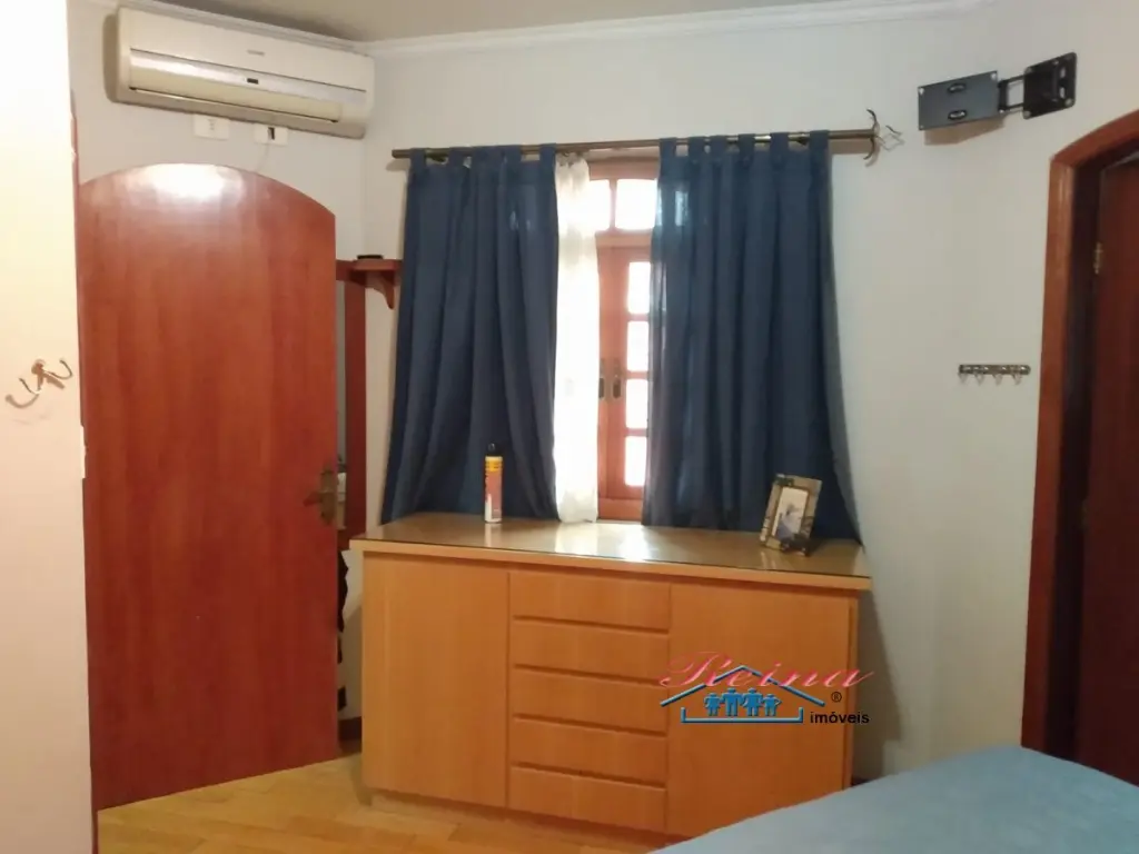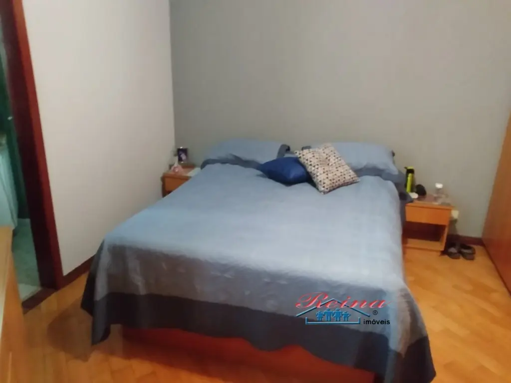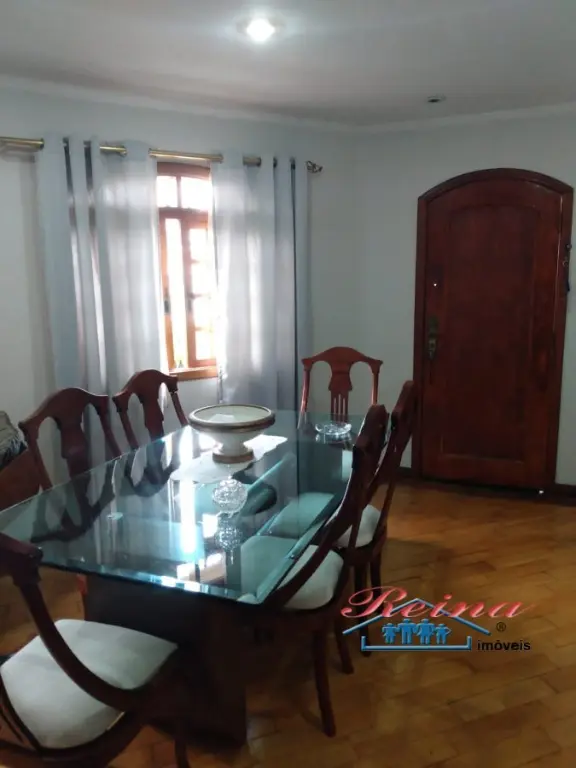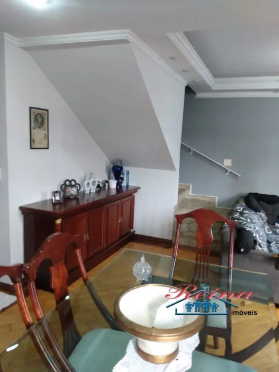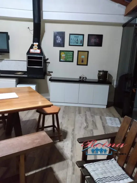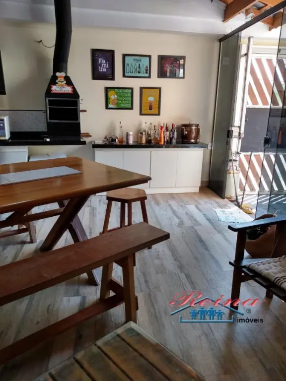 Sobrado com 3 dormito´rios (sendo 1 sui´te), ar condicionado quente e frio, arma´rio planejado, piso em madeira macic¸a (taca~o); 3 Banheiros (social, lavabo e na garagem); Sala para dois ambientes, piso em madeira macic¸a, sanca de gesso; Cozinha, arma´rios planejados; A´rea de servic¸o; Garagem para dois carros; A´rea externa com churrasqueira, mesa pra doze pessoas em madeira macic¸a, balco~es e arma´rios, a´rea totalmente fechada com vidro temperado. Dois porto~es automa´ticos. Entrada social com interfone.