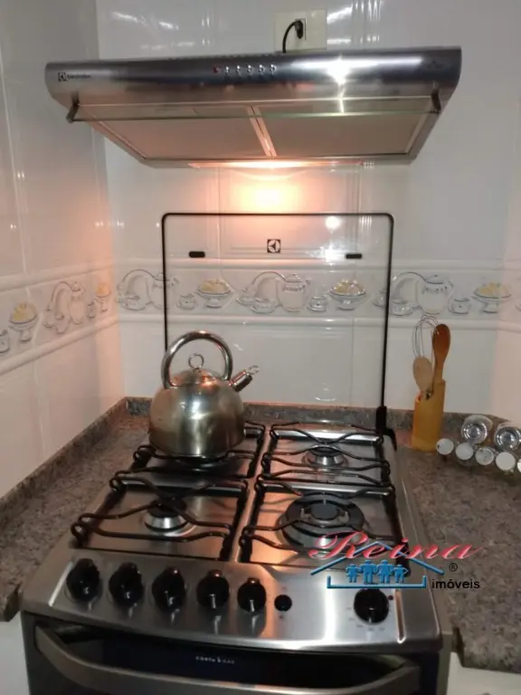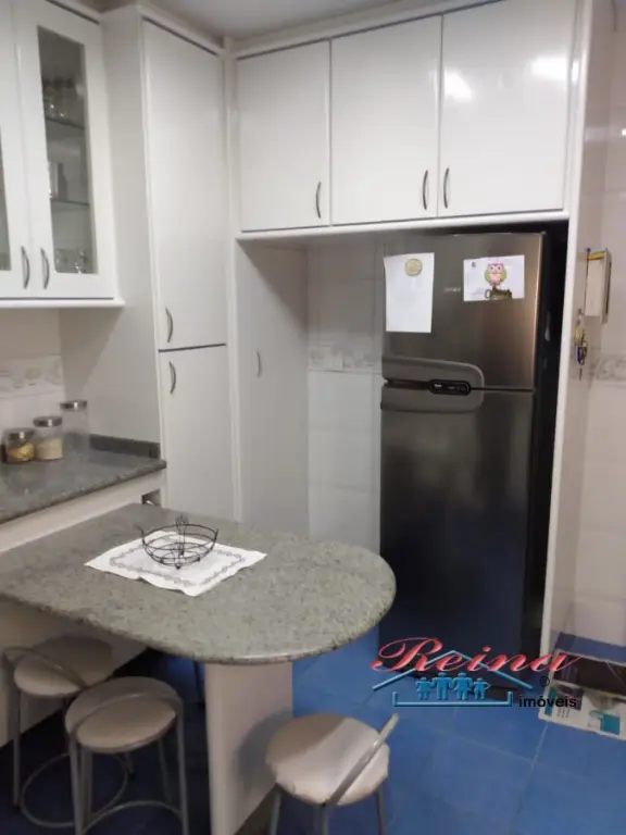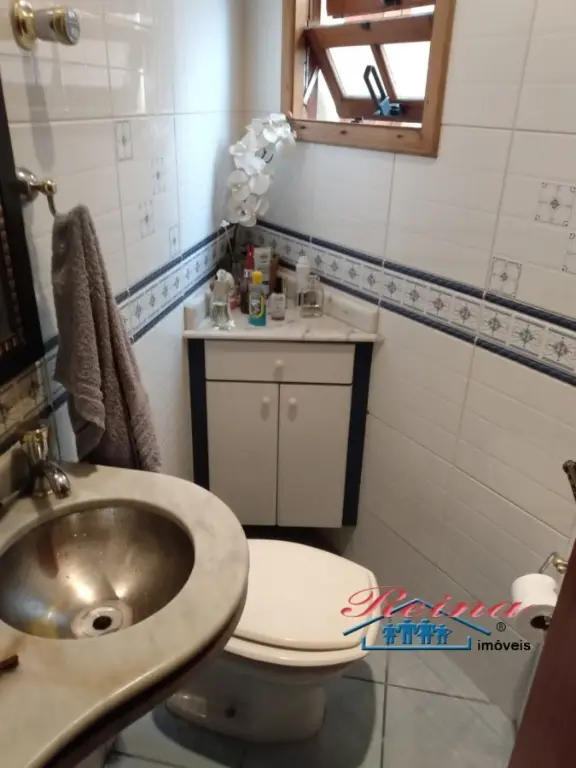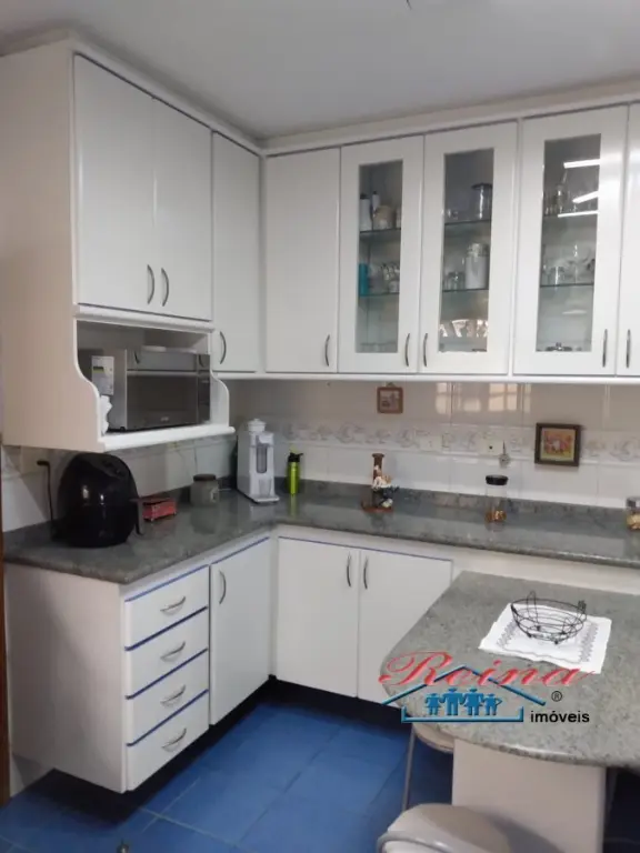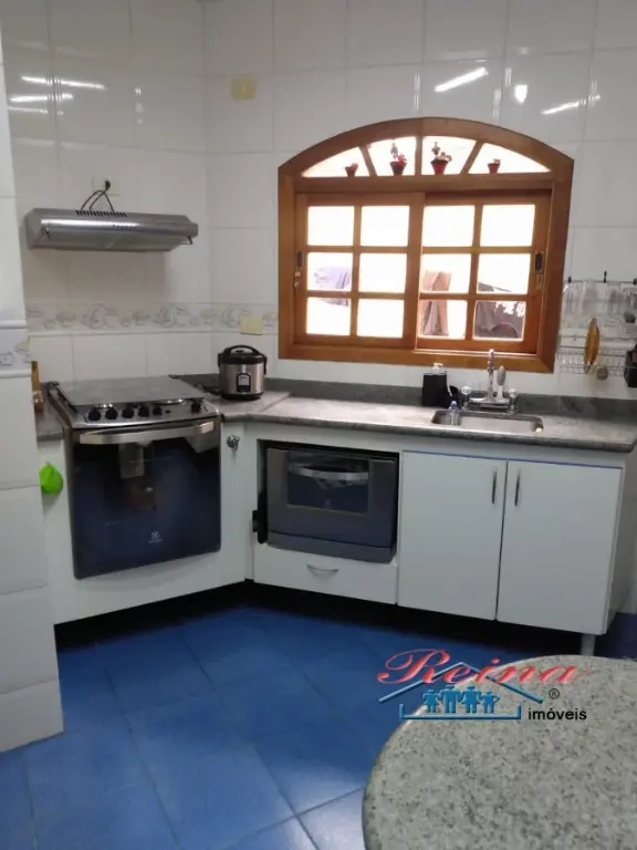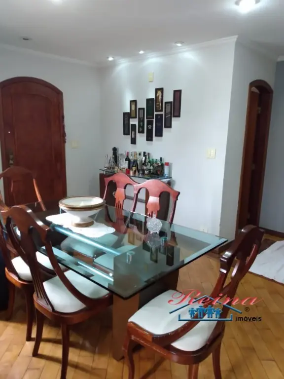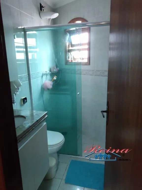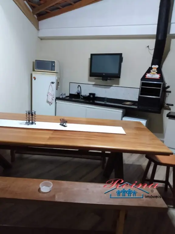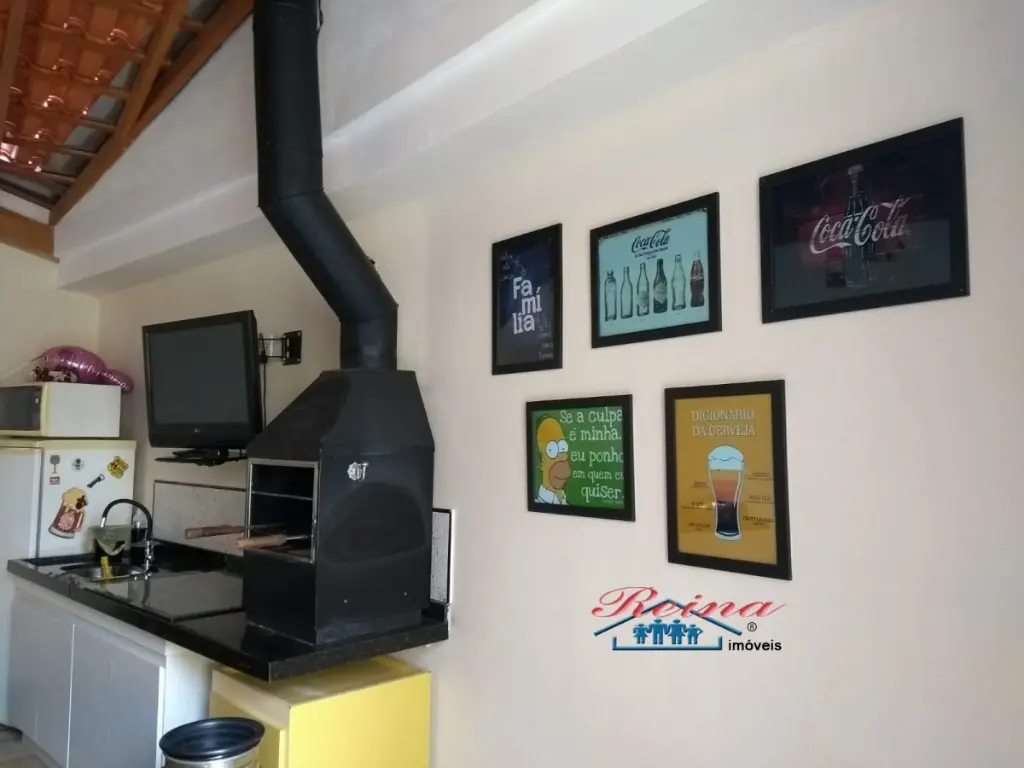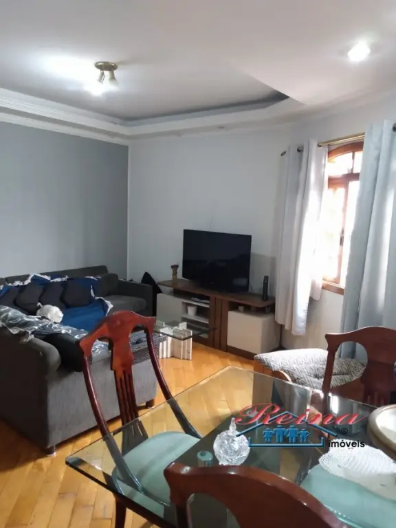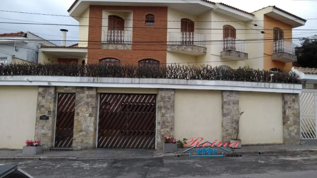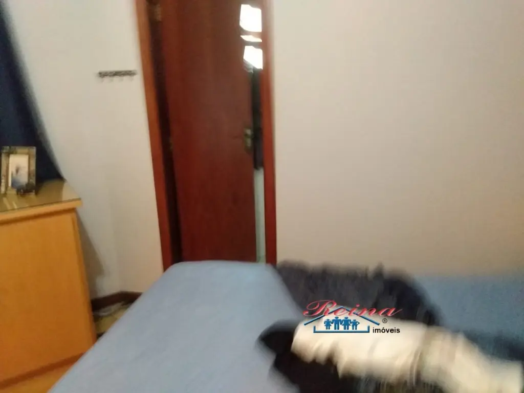 Sobrado com 3 dormito´rios (sendo 1 sui´te), ar condicionado quente e frio, arma´rio planejado, piso em madeira macic¸a (taca~o); 3 Banheiros (social, lavabo e na garagem); Sala para dois ambientes, piso em madeira macic¸a, sanca de gesso; Cozinha, arma´rios planejados; A´rea de servic¸o; Garagem para dois carros; A´rea externa com churrasqueira, mesa pra doze pessoas em madeira macic¸a, balco~es e arma´rios, a´rea totalmente fechada com vidro temperado. Dois porto~es automa´ticos. Entrada social com interfone.